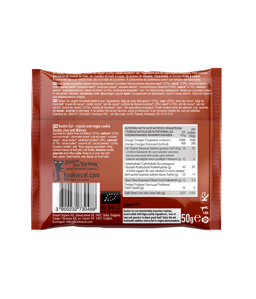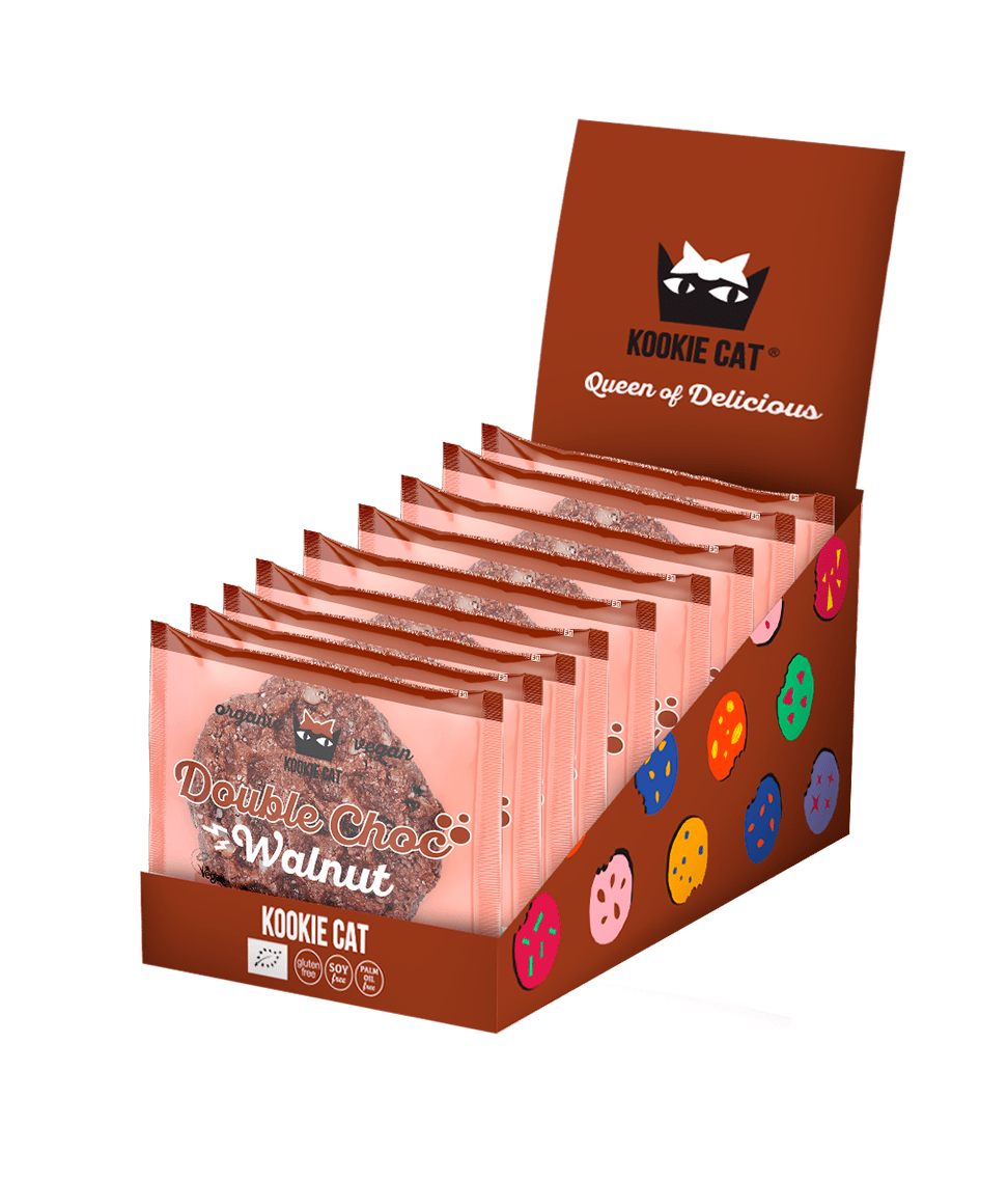 Favorittkjeksen med valnøtter har fått en enda rikere og mer intens sjokoladesmak! Kookie Cat Double Choc & Walnut kombinerer sprø tekstur, nøttefylde og mørk sjokolade av høy kvalitet – helt uten raffinert sukker. En perfekt balanse mellom søtt, crunchy og dypt sjokoladearomatisk.