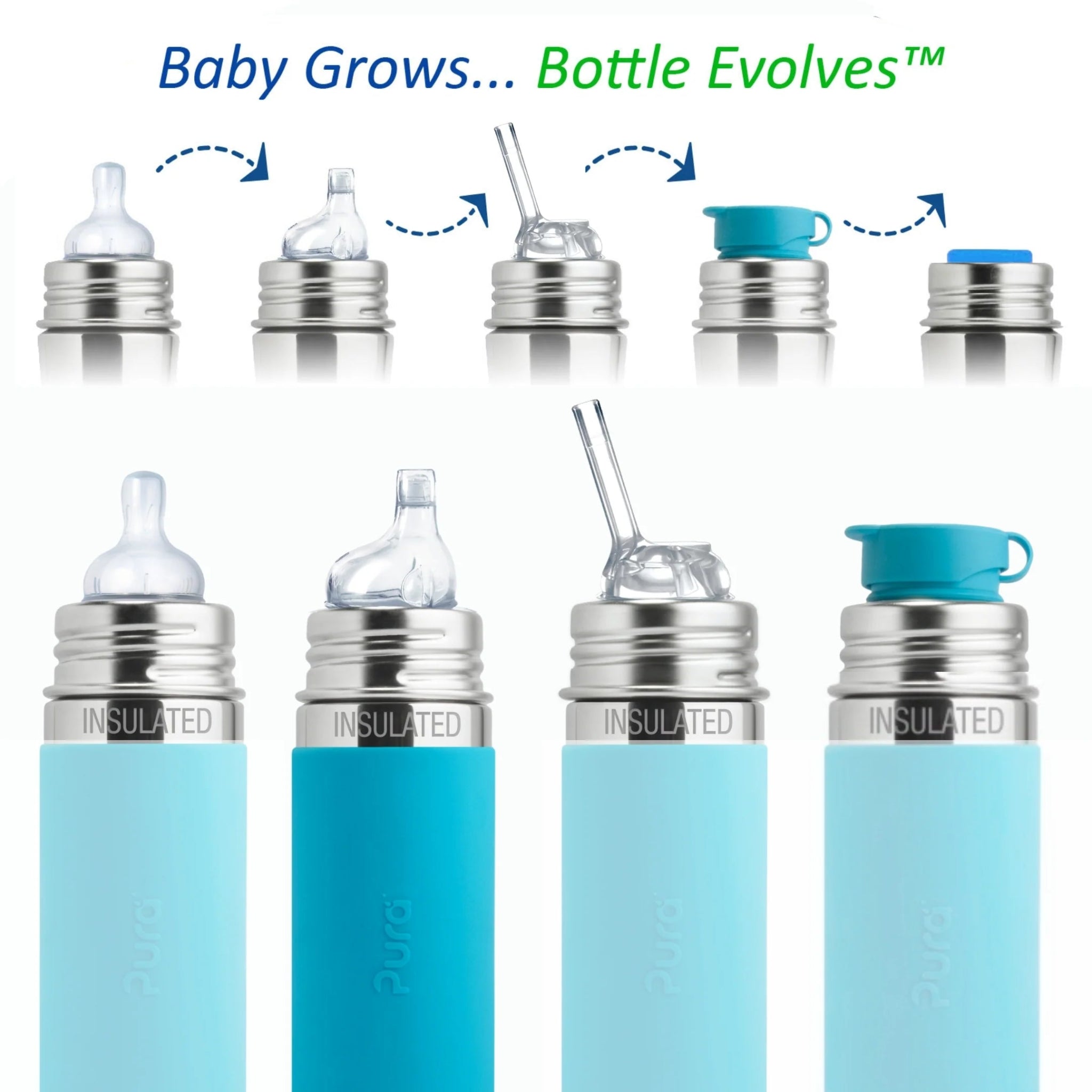 Ethvert Pura silikonlokk passer for enhver Pura-flaske - dette er holdbare flasker som "vokser" med barnet! Ved hjelp av en utskiftbar topp kan flasken enkelt bli til en sugerørsflaske eller en sportsflaske når barnet er stort nok for det.