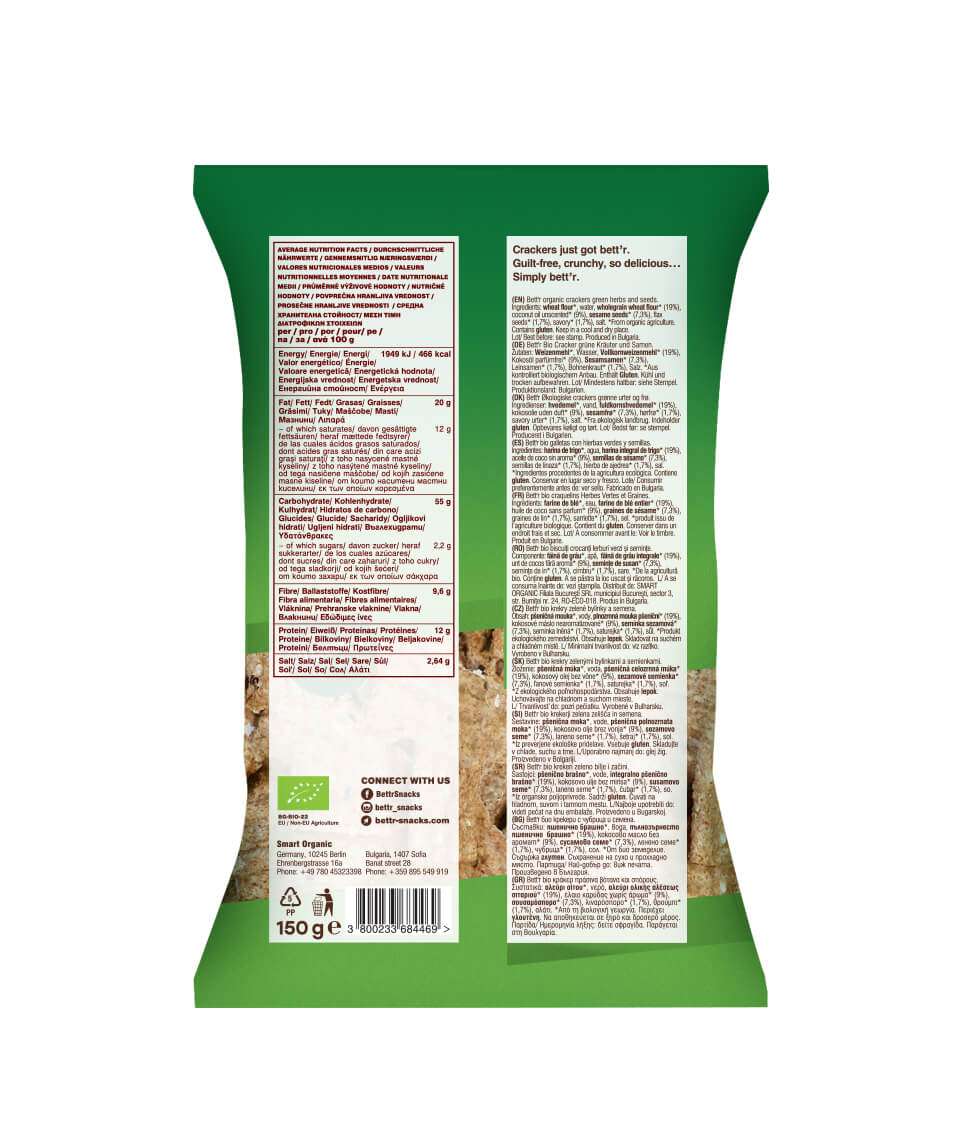 Disse avhengighetsskapende frøknekkebrødene med grønne urter er perfekte for alle som elsker noe sprøtt og smakfullt. Laget med næringsrike sesamfrø og linfrø, økologisk hvetemel og mild kokosolje – en balansert og naturlig snacks du kan nyte alene eller bruke som base for pålegg og dip.