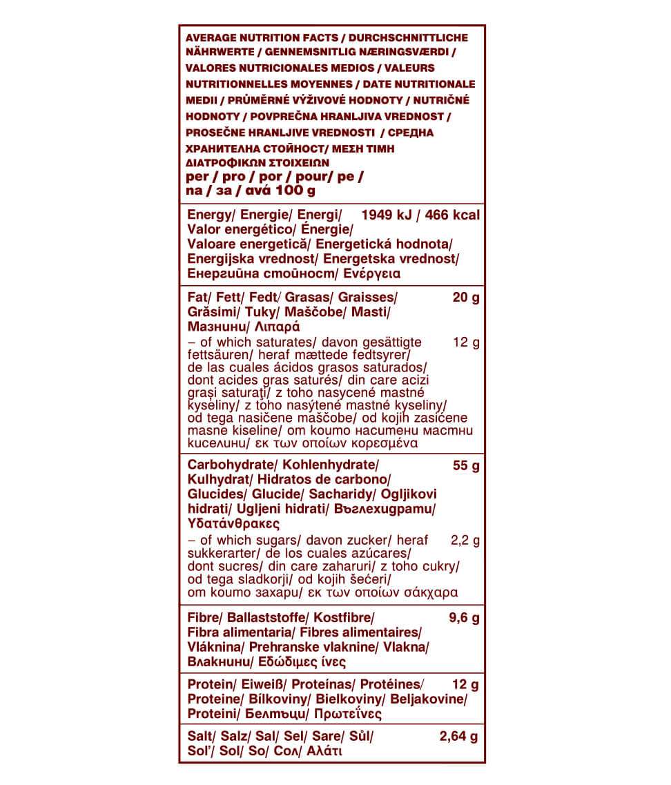 Hvetemel*, vann, fullkornshvetemel* (19 %), kokosolje (uten aroma)* (9 %), sesamfrø* (7,3 %), linfrø* (1,7 %), sar/urter* (1,7 %), salt.