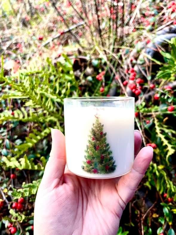 Julelyset har en treveke og et klistremerke av et juletre for å sette den riktige stemningen.