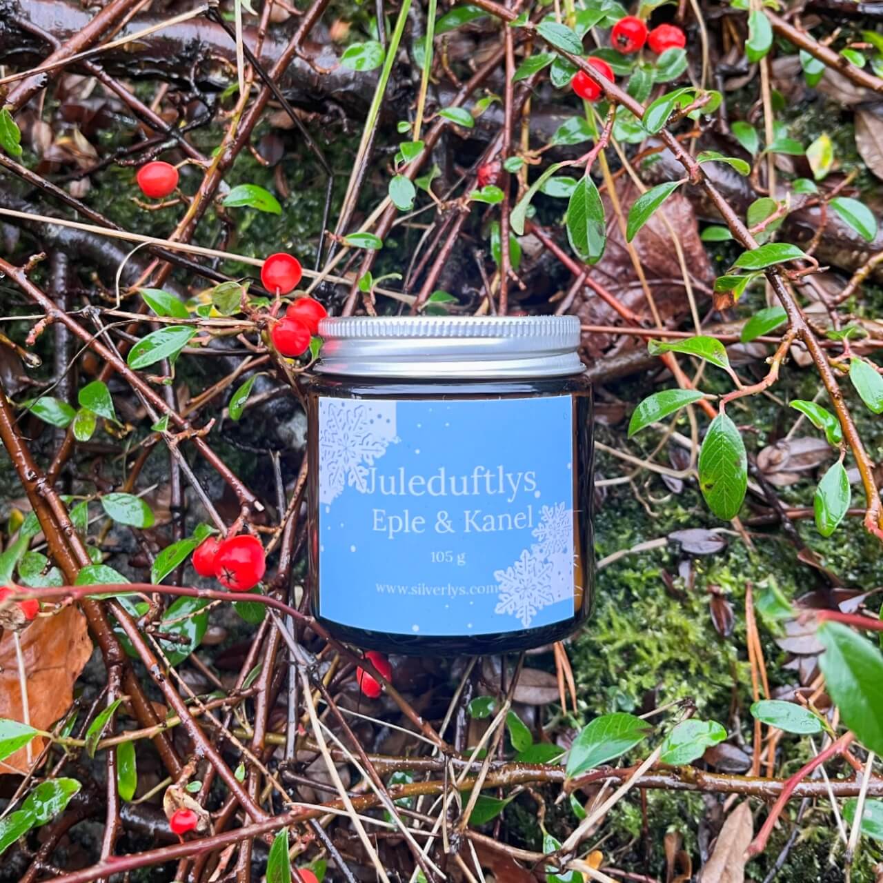 Julelyset har en treveke og et klistremerke i skandinavisk stil.