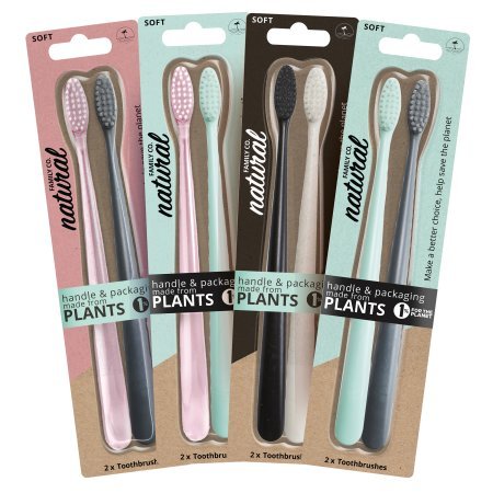 En komposterbar tannbørste fra Natural Family Co. som passer for både voksne og større barn. Laget av 100% nedbrytbar maisstivelse (uten GMO). Busten er laget av BPA-fri nylon.