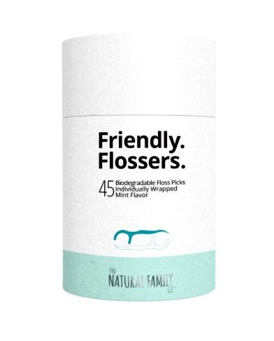 En boks inneholder 45 miljøvennlige individuelt pakket tanntrådbøyler med biologisk nedbrytbart håndtak og innpakning laget av maisstivelse og resirkulerbar tanntråd av nylon med mint smak.
